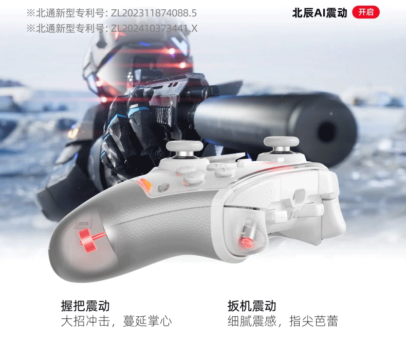 鲲鹏40提供了行业首创的双限位摇杆、AI语音/震动、AI记忆面壳等高端功能。北通通过自主研发的TMR摇杆技术(超越霍尔摇杆)、智能急停节能马达(专利ZL202311874088.5)等核心技术,将专业电竞设备的性能下放至大众市场。
