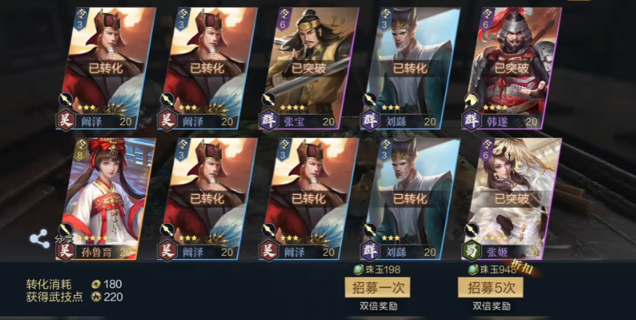 其抽卡机制对非RMB玩家极为友好。高达8%的高橙将概率,还有20抽保底的设定,就像给玩家吃了一颗定心丸,大大增加了获取强力橙将的机会。武将等级无损置换和战法重置仅耗铜币的设定,让玩家在培养武将时可以大胆尝试不同组合,不用担心资源浪费。即使是不充值的玩家,也能和氪金玩家站在同一起跑线公平竞争核心资源。