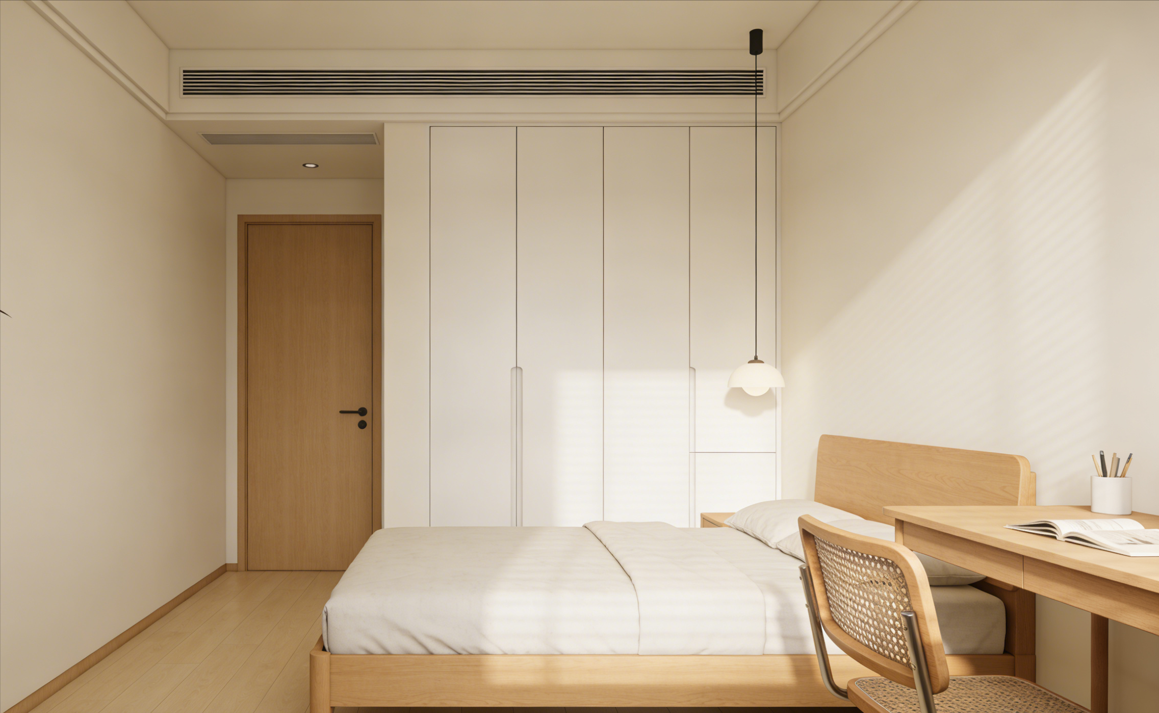 次卧面积约8平,整体延续奶油风基调,墙面刷浅米色乳胶漆,地面通铺浅原木色哑光地板,脚感温润。空间采用“定制衣柜+灵活家具”布局,衣柜做嵌入式设计,奶白色柜门搭配隐形拉手,与墙面融合,节省空间的同时保持风格统一。目前摆放一张1.2m原木色单人床与简易书桌,预留足够活动空间,未来可根据孩子性别与年龄调整软装,打造专属儿童房。