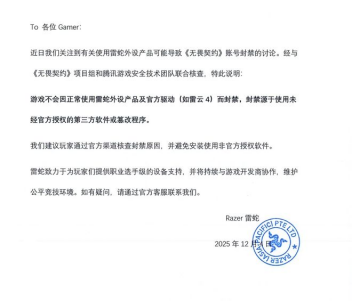 12月2日《无畏契约》突发的大规模封号事件,让雷蛇外设陷入“致账号被封”的舆论漩涡。12月4日,雷蛇官方联合《无畏契约》项目组及腾讯游戏安全团队发布核查声明,明确正规外设不会导致封禁,封号根源直指第三方违规软件。
