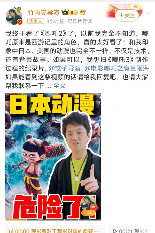 在全球化的今天,文化之间的交流与理解变得尤为重要。而艺术作品,尤其是电影和纪录片,成为了跨文化交流的重要载体。近日,一位名叫竹内亮的日本纪录片导演引起了广泛关注。他不仅以其对中国文化的深刻理解和热爱而闻名,还因其提出拍摄《哪吒3》制作过程的纪录片而受到网友的热烈支持。这一举动不仅展示了他对中国文化作品的认可,也为我们思考国际之间文化交流提供了新的视角。