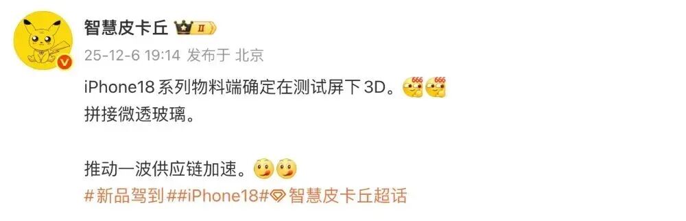 据悉,博主@智慧皮卡丘 近日的一份爆料中提到,“iPhone 18系列物料端确定在测试屏下3D。拼接微透玻璃。推动一波供应链加速。”