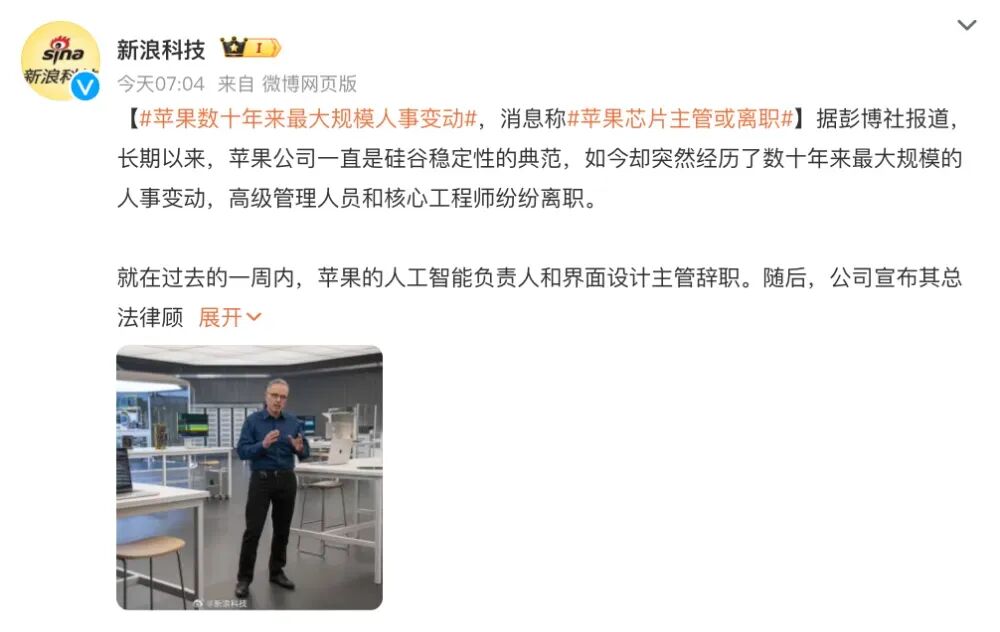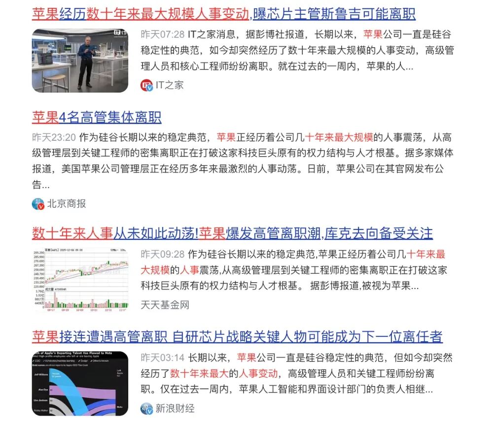 新浪科技今天的报道显示:“长期以来,苹果公司一直是硅谷稳定性的典范,如今却突然经历了数十年来最大规模的人事变动,高级管理人员和核心工程师纷纷离职。”