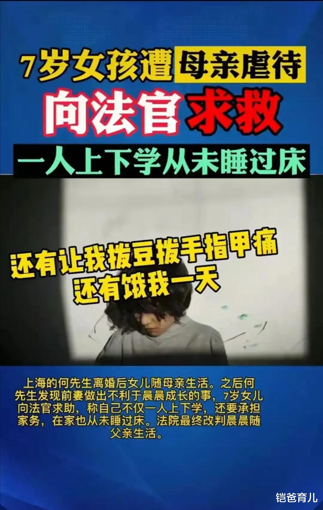 看到这里大家都觉得这不是后妈才干得出来的事吗?而一个亲妈的这般做法着实让人觉得匪夷所思啊。晨晨的爸爸之所以没有争取孩子的抚养权,是因为晨晨的妈妈现任丈夫是外籍人士,说到时候可以带孩子出国读书,而晨晨的妈妈如此对待女儿,也是因为这个现任丈夫说中国的孩子普遍缺乏吃苦,而晨晨的妈妈就是如此这般让孩子“多吃苦”的,我想说这是虐待孩子,而不是让孩子吃苦这么简单。