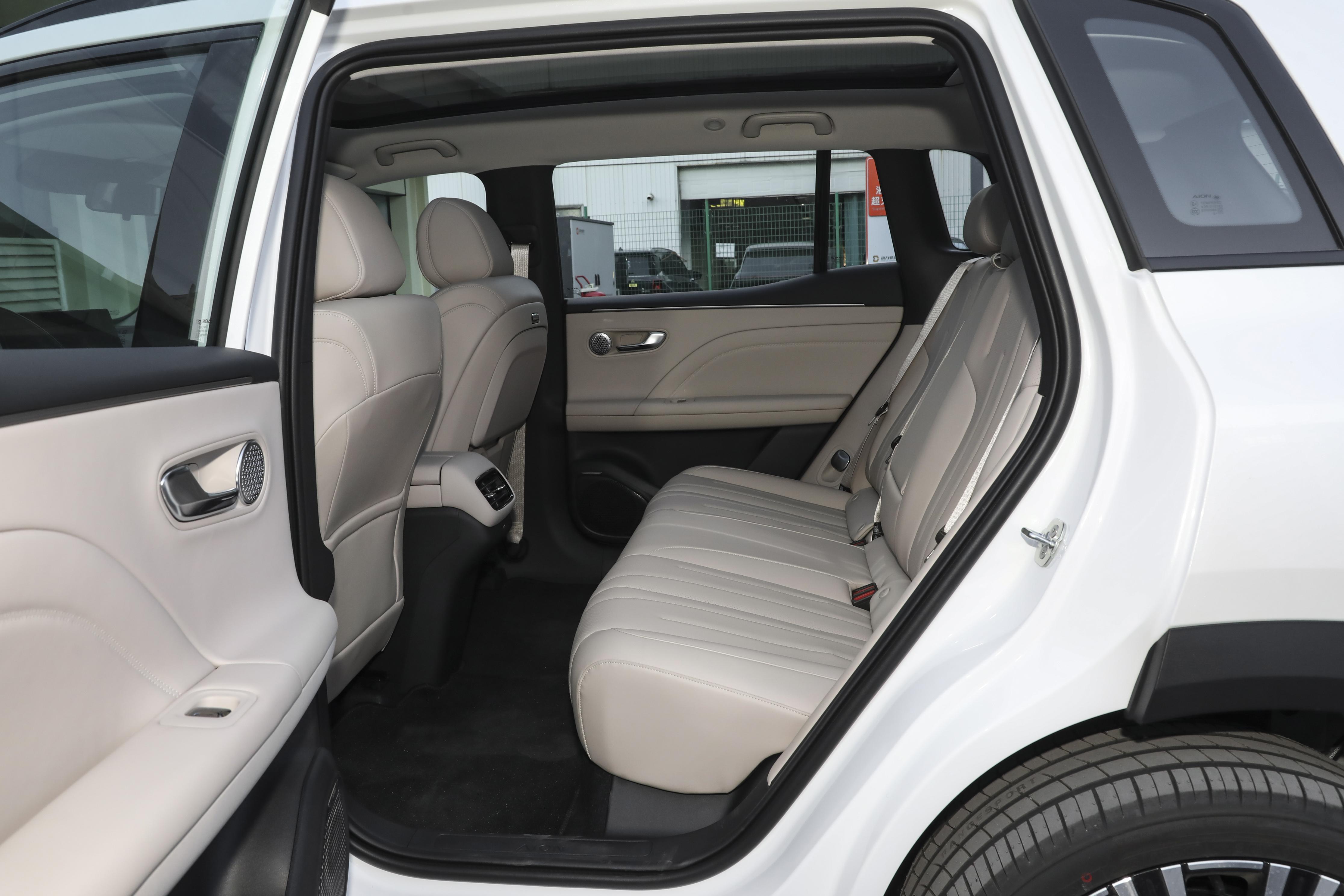 实车乘坐感受了下,身高175厘米体验者将前排座椅调到合适的驾驶坐姿,坐到后排,头顶还有接近2拳的空间余量,膝盖距离前排座椅靠背有3拳余量,空间确实很大,并且后排地板较为平整,坐垫长度一致,中间位置乘坐不难受,后门开启角度接近90度,上下车很方便。