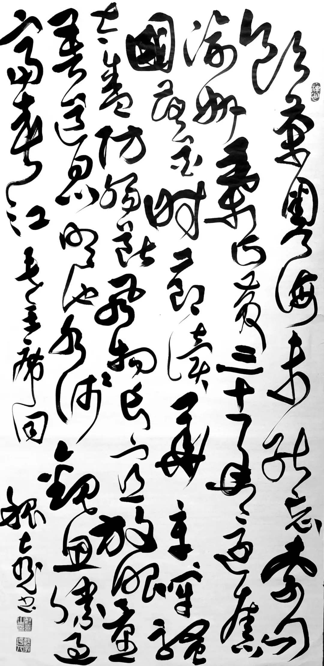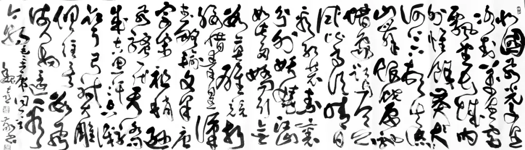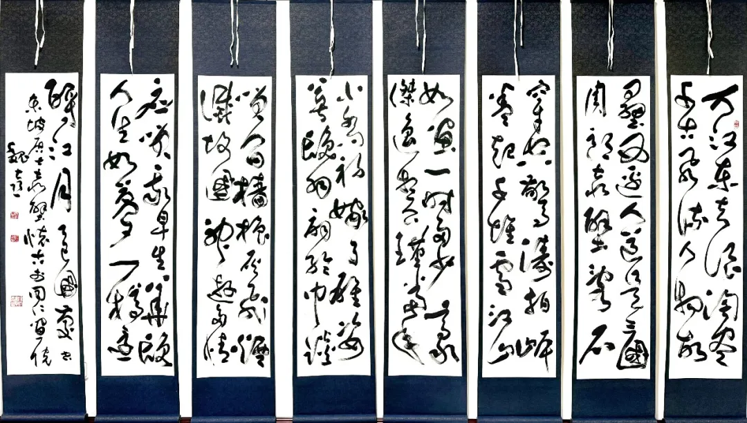 魏喜书法以草、隶二体最为精擅,二者一动一静、互为表里,共同构筑其完整的书法根基。其书学之路根基扎实,初以魏碑筑基,兼攻唐楷,上溯“二王”体系,于法度中锤炼笔性,在临摹中体悟古法,为后续艺术创新筑牢根基。在草书创作上,他潜心师法怀素之圆劲、傅山之跌宕、王铎之气势,将历代狂草大家的笔墨精髓与个人审美体悟相融,摒弃狂草常见的粗率浮滑,凝练出“纵而不野、放而有度”的独特风格。其草书线条刚柔相济,提按顿挫富于变化,筋骨内含而气韵外显;章法布局开合有度、气脉贯通,时而密如潮涌,时而疏若云散,在强烈的视觉节奏中保持整体和谐统一,兼具力量之美与韵律之美。