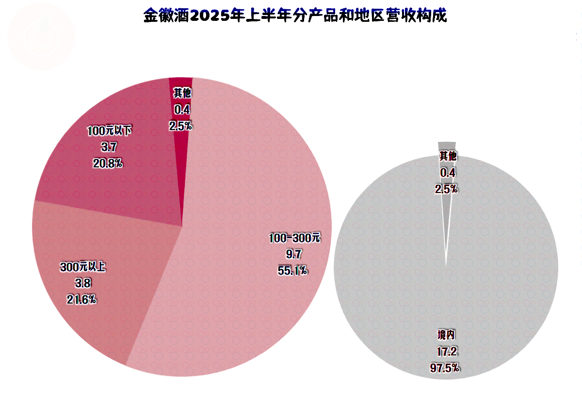 金徽酒比其他酒厂都要实在,按其产品的价格区间来分类产品和统计营收,其主力产品是100-300元的中档白酒,占比55%左右;300元以上和100元以下的产品各占两成出头,应该没有完全跟随同行们主力产品高端化的步伐。主要的市场都在境内,其他业务那部分占比,应该也是境内的非白酒类业务。