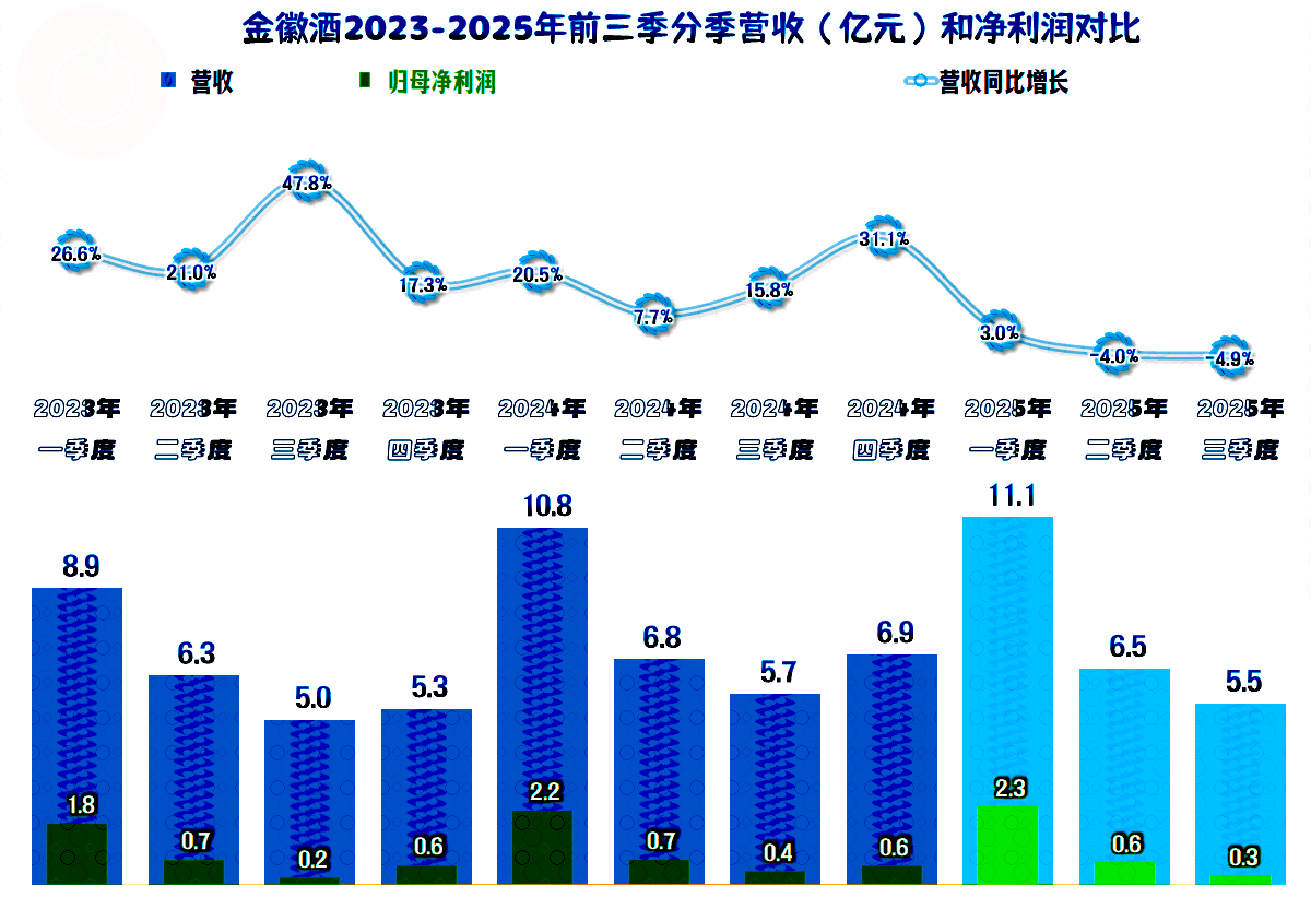 2025年前三季度,金徽酒的营收同比下跌1%,这是多年不见的下跌。就算2020年前三季度也有过下跌,但全年也转为增长,而且大家都知道,那是疫情突然爆发所带来的暂时影响。