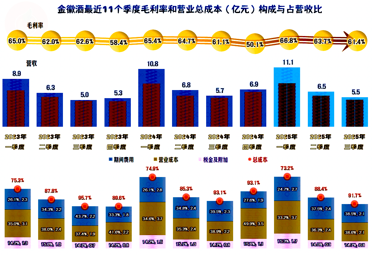 2025年的前三个季度,并非所有季度的主营业务盈利空间都高于去年同期,其二季度的表现就不是太好。毕竟现在是明显的“弱市”,或者说是波动中的市场,增长应该都是暂时的;包括金徽酒在内的厂家,都需要引起高度的重视。