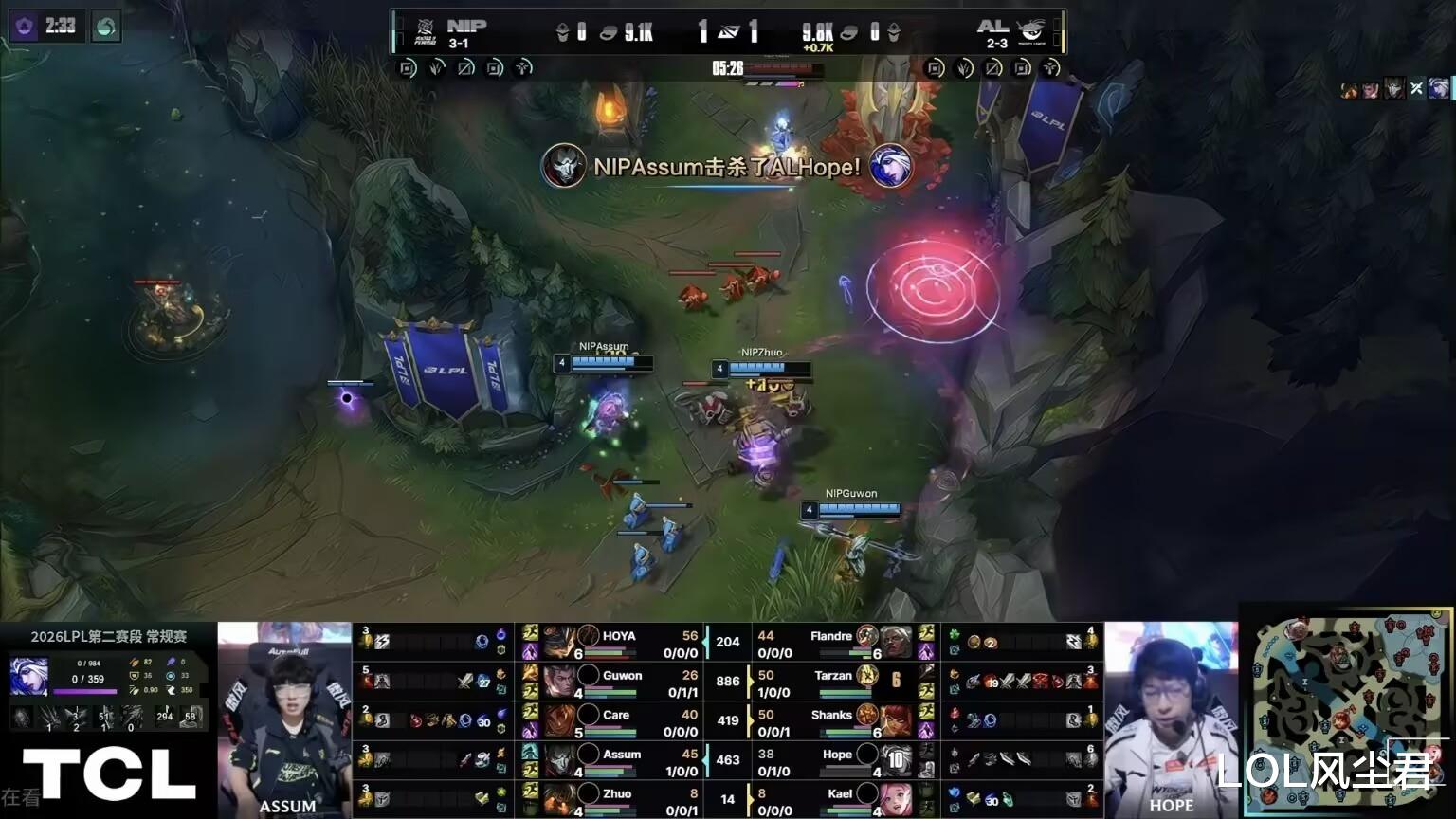 LPL第二赛段组内赛,第三周已经开赛了,上一个比赛日,黑马战队NIP,和打满冠AL展开对决,一个势头正盛,一个状态低迷,赛前观众都以为,NIP有赢下AL的机会,结果两场看下来,NIP本质还是涅槃,除了下路的阿萨姆,对线能稳压Hope之外,剩下的位置,NIP对位都打不出优势。
