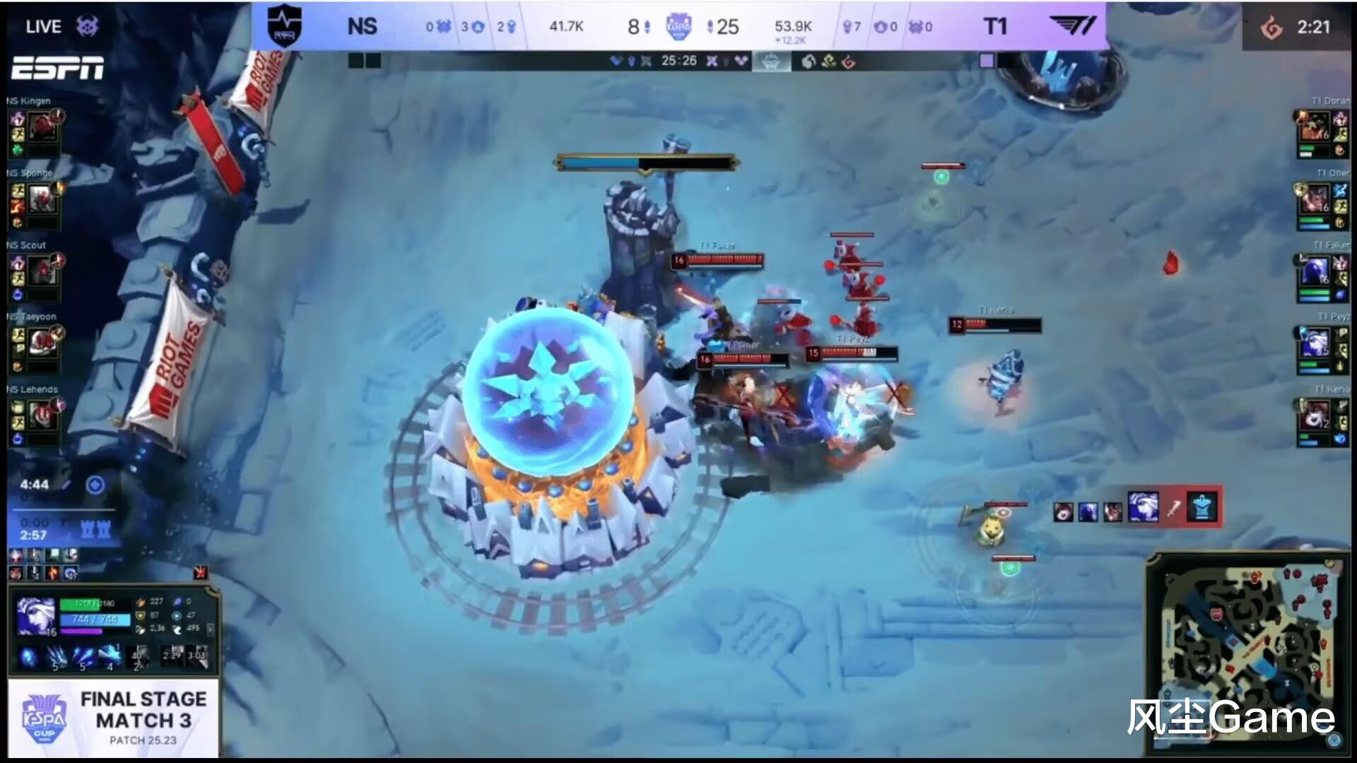 这一局Peyz用卡莎,砍下了在T1的首个五杀,决胜局老李突然出问题了,对位连续被Zeka单杀三次,阿卡丽天肥开局,T1团战后排一秒就倒,Zeka砍下13-8-0的豪华战绩之后,T1基地被推平,就此跌入败者组,和NS成功会师,败者组第一轮的比赛,也在下半区结束之后,立马就打响了。