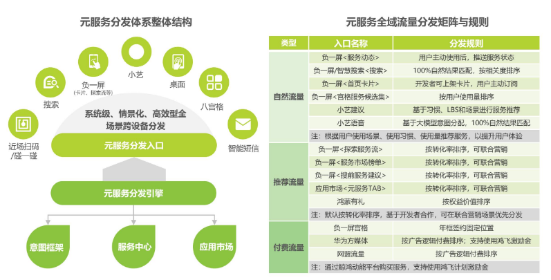 再说“节流”,也就是在降本增效方面。报告提到,针对开发者面临的传统应用商店中心化分发导致的获客成本高的痛点,鸿蒙元服务深度融合意图框架、服务中心与应用市场,依托服务动态规则、LBS触发、联合营销等第略,从根本上破解获客难题:比如小艺建议和小艺语音的自然流量,以及鸿蒙有礼、负一屏探索服务流的推荐流量,还可以通过负一屏八宫格的年框签约固定位置获取更多付费流量。有了这三大矩阵,开发者就有了成本更低、效率更高的分发渠道。