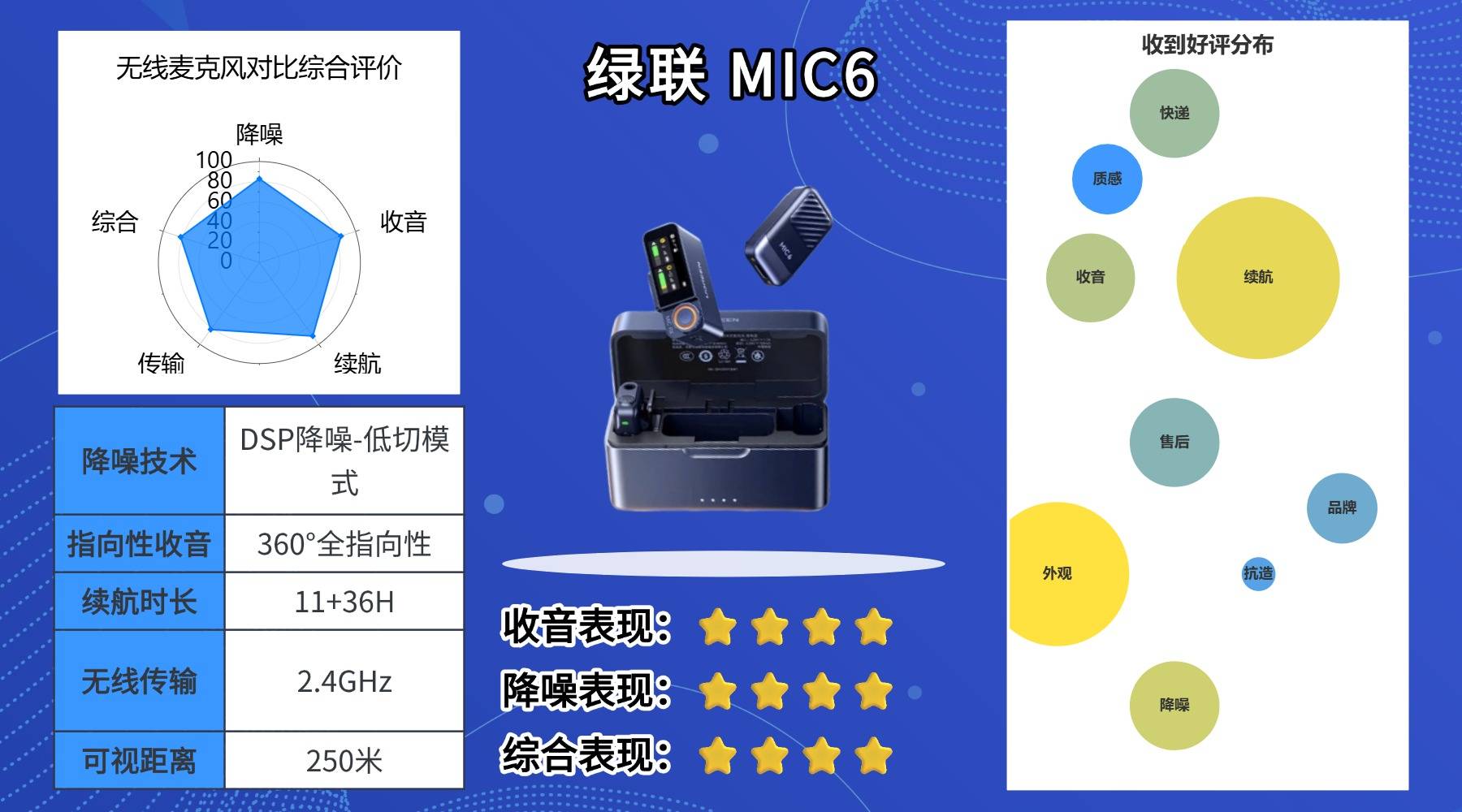 实用型入门级产品,核心亮点是稳定传输和易用性。2.4GHz无线传输技术抗干扰性强,几乎无断连和延迟,兼容手机、相机等主流设备,即连即用,无需额外调试。360°全指向拾音设计配合高保真收音单元,准确捕捉声音细节,外观简约、做工精致,兼容性和续航表现不错,是看重基础实用性的新手创作者的靠谱选择。