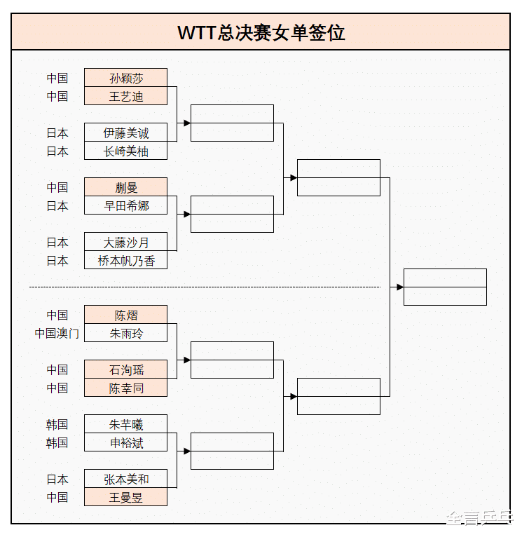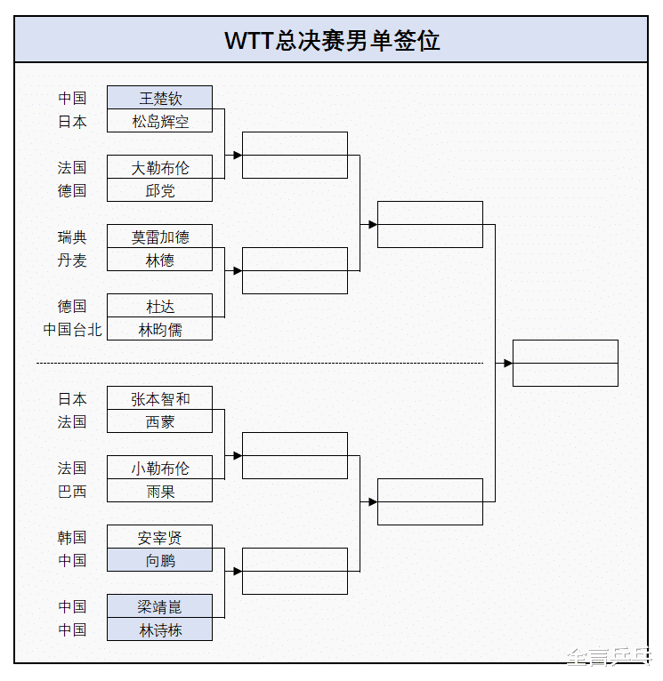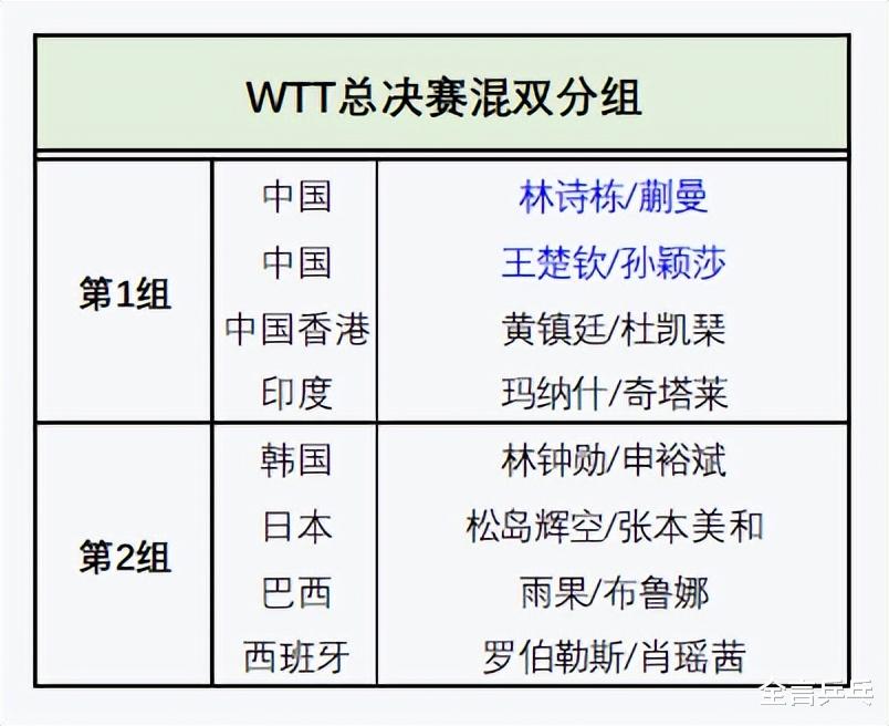 本届总决赛共设置三个项目,分别是男单、女单、混双,国乒分别有4人、7人以及2对组合参加,拿到了最多的名额,三项详细签位如下(注:男单、女单直接开始淘汰赛,混双先进行小组循环赛,每组取前二名晋级组成4强名单)——
