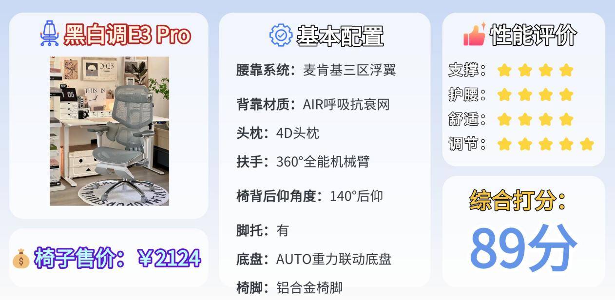 E3 Pro是一款“功能多、支撑稳、性价比高”的常用型人体工学椅。腰部的云翼追腰系统支撑分区明确,适合日常办公久坐。
