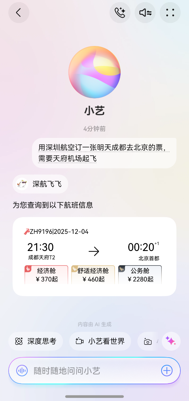 经常飞来飞去的出差党,这下也更省心了。以前每次订机票都得搜目的地、选时间。现在试试对小艺说:“用深圳航空订一张明天成都去北京的票,需要天府机场起飞。”小艺会喊出深圳航空智能体深航飞飞,瞬间拉出航班列表,点击就能订票,还能语音值机、选座。要是航班有变动,它也会立马提醒你,妥妥的私人出行管家。