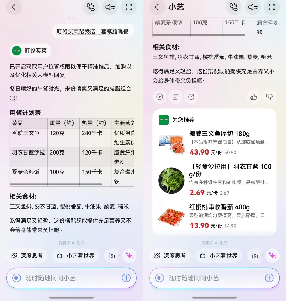 每天下班最头疼的不就是“吃什么”吗? 累了一天脑子都转不动了,哪还有心思琢磨食谱。这个时候直接跟小艺说:“用叮咚买菜帮我搭一套减脂晚餐。”小艺会立马召唤叮咚买菜智能体,不仅把热量给你安排好,还能直接放上相关食材的链接,点击就能跳转到应用内把喜欢的食材加进购物车,晚饭直接安排得明明白白。