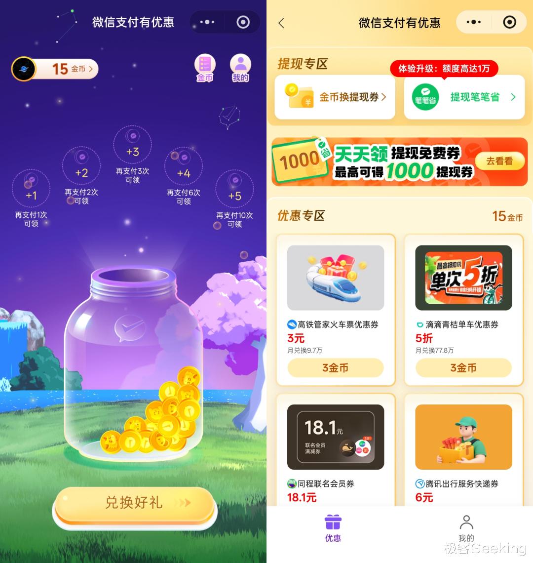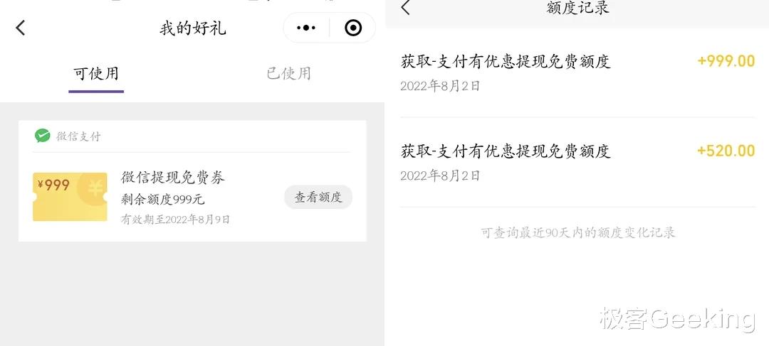 而且微信在特别的日子还会推出主题活动,能领取到大额提现免费券,比如在春节、七夕节和中秋节参与小游戏就能轻松拿到上千元的提现免费券,曾经极客君写过多篇文章分享内容,相信关注我比较久的读者应该还记得。