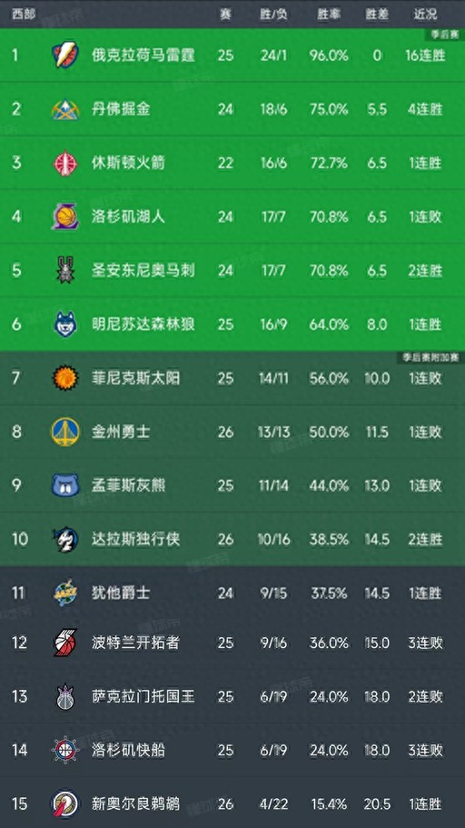 北京时间12月13日,今日的NBA常规赛结束了所有比赛,出战比赛的西部球队只有5队,我们一起看看西部积分榜的变动,主要的信息如下:勇士120-127不敌森林狼,独行侠119-111战胜篮网,灰熊126-130不敌爵士!