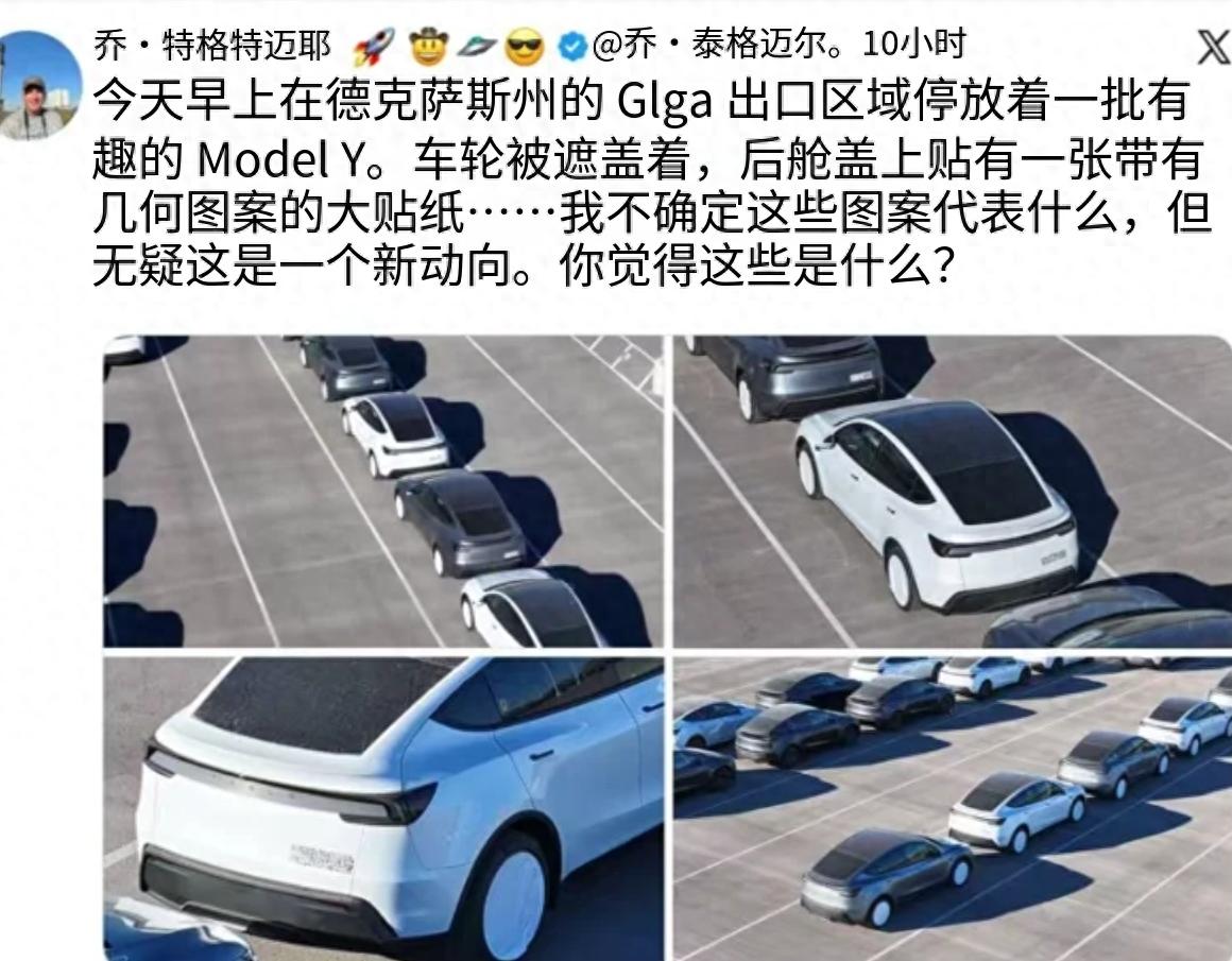 特斯拉又要搞大动作了!海外博主Joe Tegtmeyer在德州超级工厂航拍时,拍到了一批疑似改款Model Y的实车,轮毂被遮挡、车尾贴着带几何图案的超大贴纸,甚至有轮毂保护套脱落的车型露出了新款灰色20寸helix 2.0轮毂,瞬间引发全球车迷热议——这波“剧透”是不是意味着改款Model Y要来了?