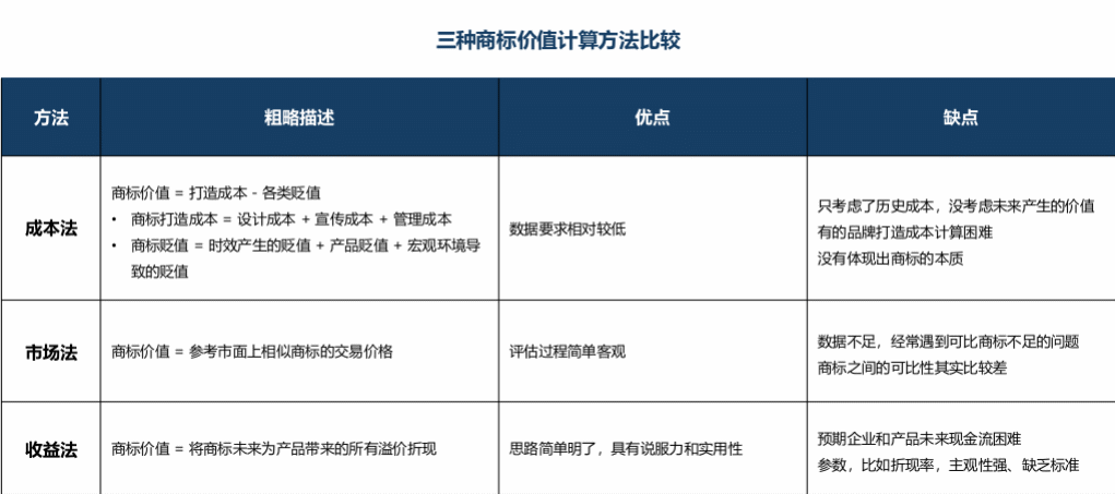 常见的评估商标价值的办法包括:成本法、市场法、收益法。用一句话介绍它们的核心思路——