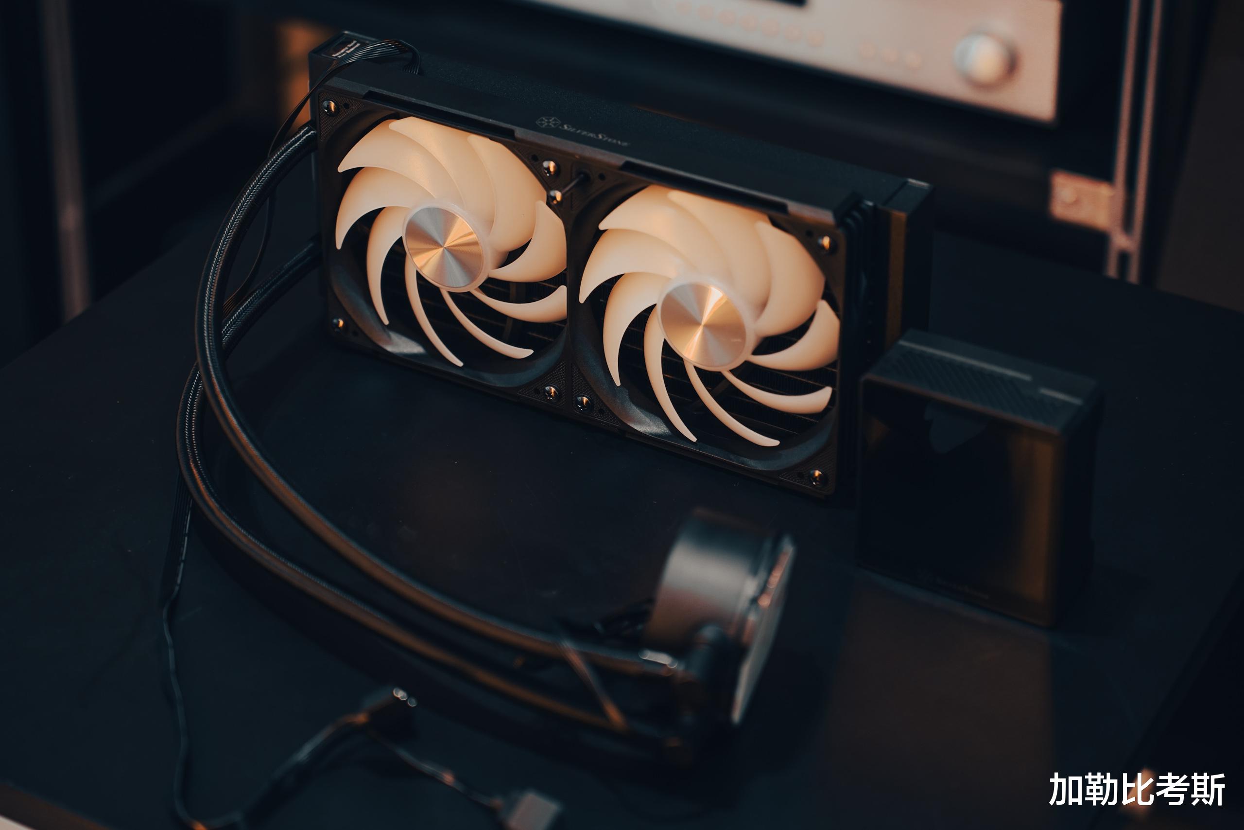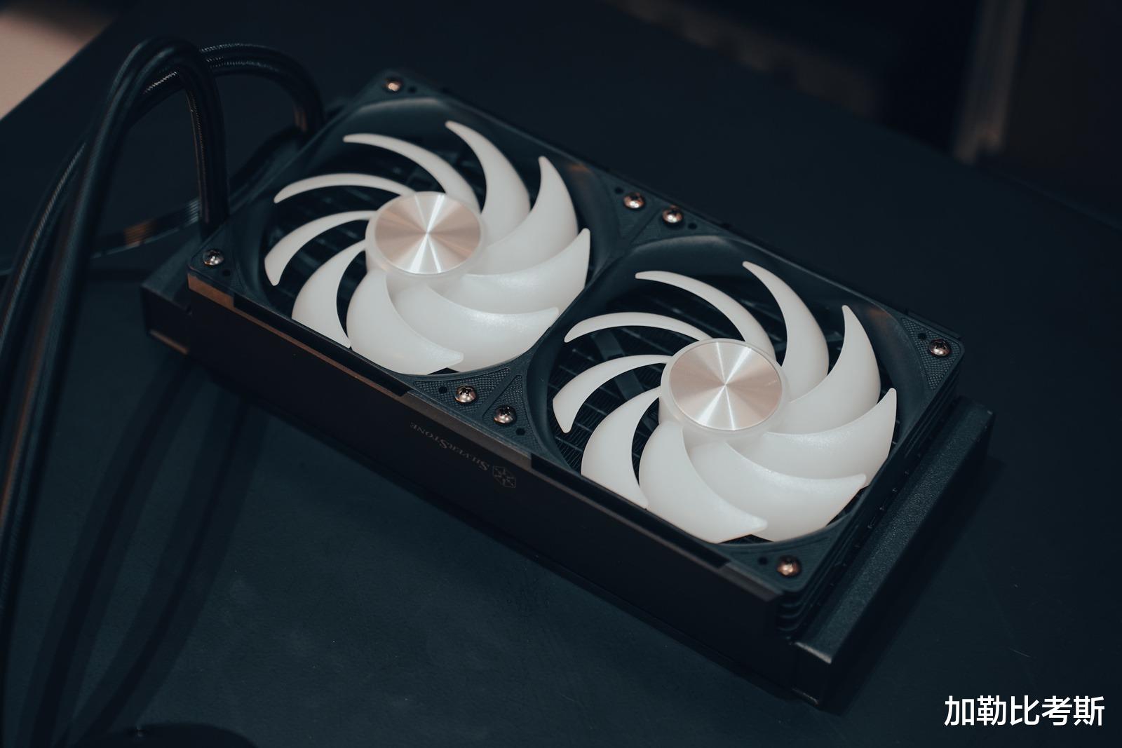 虽然是120mm,但上下加了装饰盖板,把固定螺丝都挡住了,视觉上看起来更饱满、更整洁。采用的是9片扇叶是乳白色的,水冷管外面包了编织网,接口处也有金属加强件,摸起来手感扎实,没有那种廉价的塑料感。