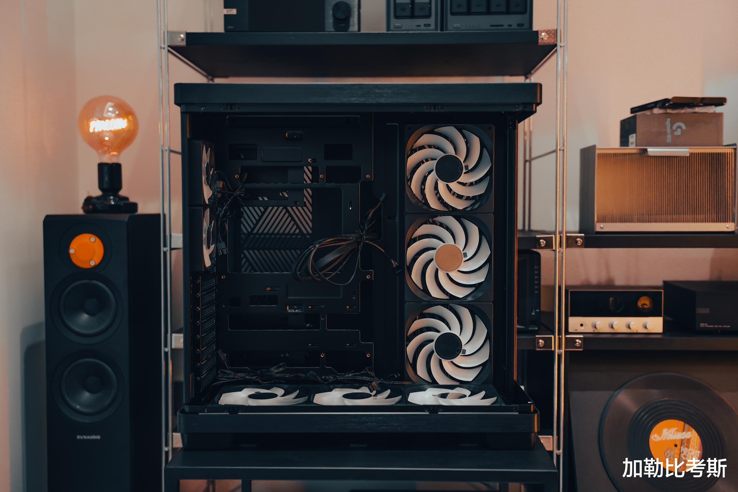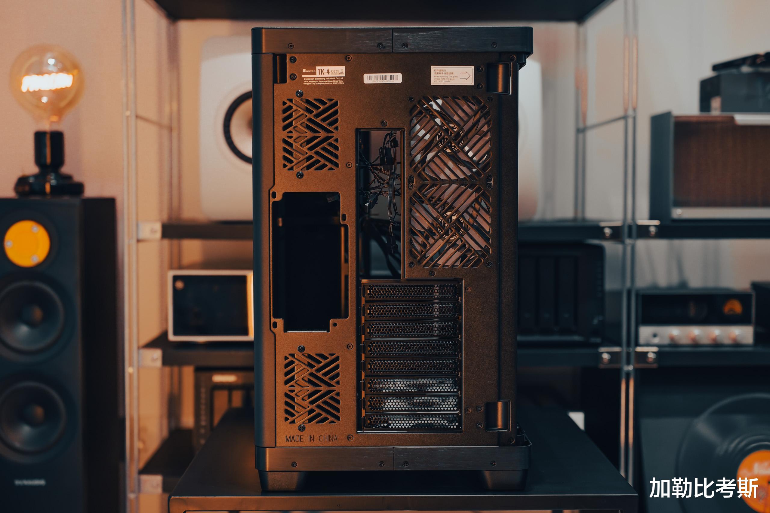 还有一个设计上的遗憾点需要说明:尽管机箱整体很大,但尾部只预留了两个 92mm 的小风扇位,而不是主流的 120mm,这导致可选的风扇型号非常少。总的来说,如果你不在意它比较占地,并且能接受尾部小风扇的设计,乔思伯 TK-4 确实是目前市面上展示高端硬件、尤其是这套黑色系高性能配置的最佳载体之一。