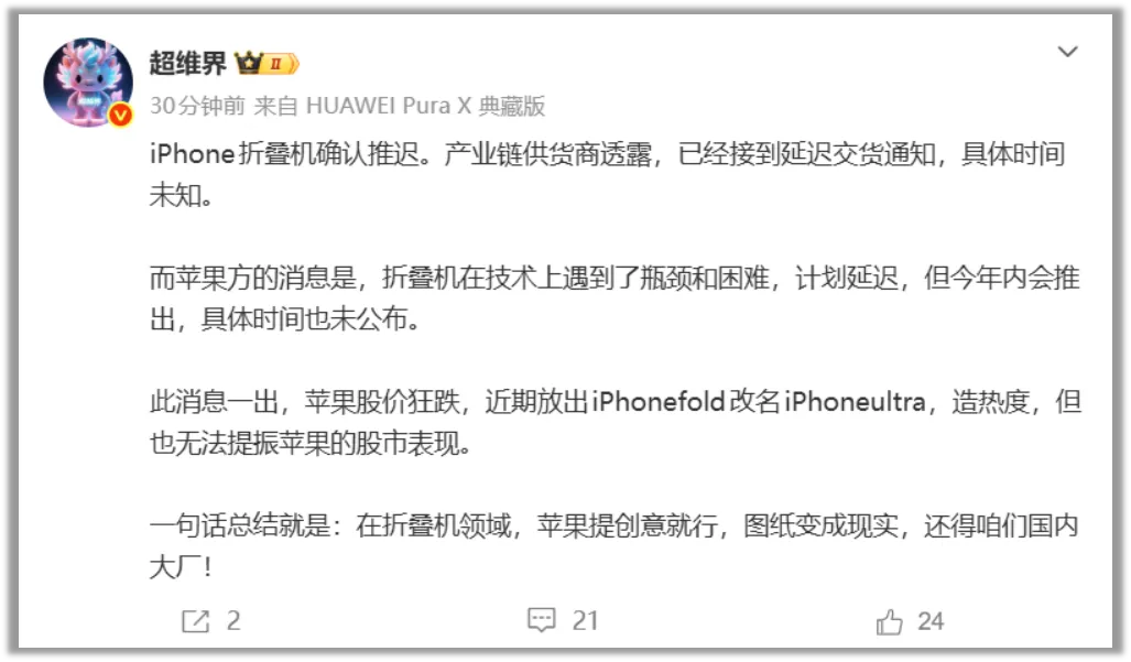 据数码博主“超维界”最新爆料,苹果的首款折叠屏手机确认推迟了。核心信息只有一句话:产业链供货商透露,已经接到延迟交货通知,具体时间未知。