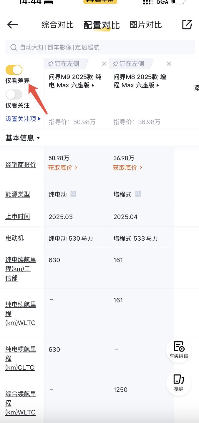 看车先看配置,以问界M8对比问界M9为例,示例图如下: