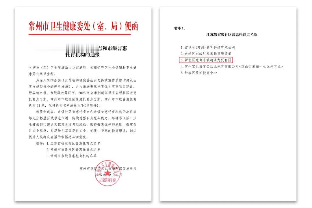 近日,在常州市卫生健康委员会公布的2025年度普惠托育民生实事项目评定结果中,龙城国控集团教育板块精心打造的社区嵌入式托育服务项目——“萌萌龙”普惠托育园(龙育东坡园),成功入选“江苏省省级社区普惠托育点”名单。这一省级荣誉的获得,是对龙城国控集团战略布局民生事业、积极践行国企社会责任、深耕高质量普惠教育服务的权威肯定与高度认可。