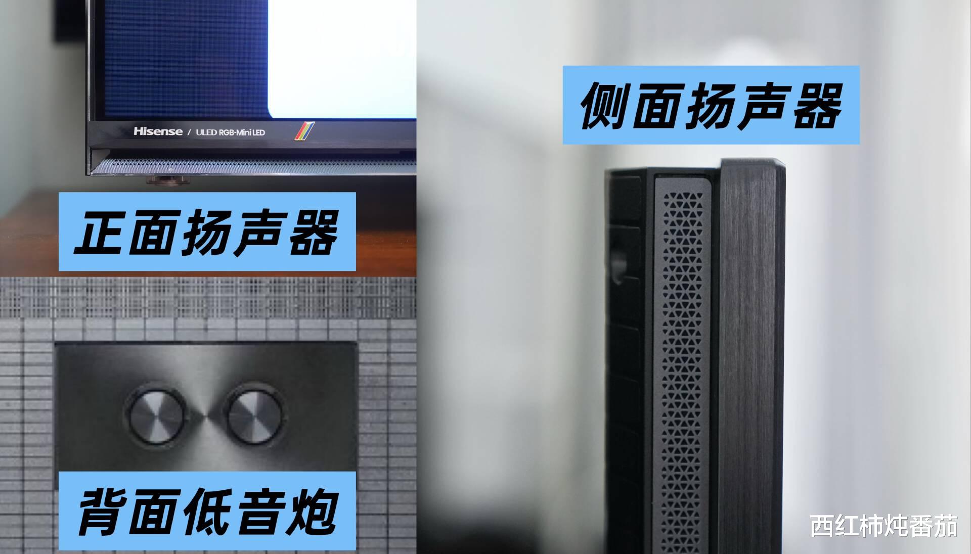 这台海信85U7S Pro不仅正面屏幕下方有一整排扬声器口,而且两侧纵向也是一整条的扬声器。此外在机器背面,半外置了一对专利低音炮,升学体积比普通电视低音炮大了 40%,低频表现更加澎湃有力 ▲