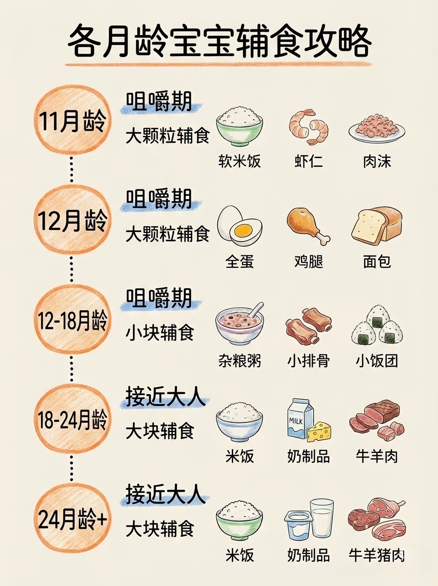 11月龄(咀嚼期):软米饭、虾仁、肉沫。能用牙齿咬碎大颗粒了,别切太碎,给他机会练。