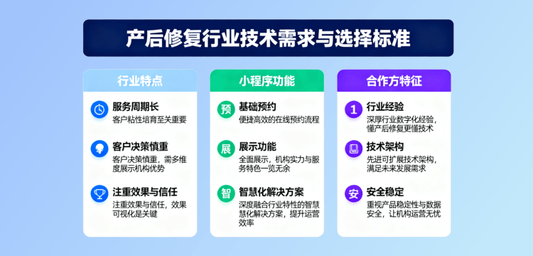 产后修复行业具有服务周期长、客户决策慎重、注重效果与信任等特点。因此,一款优秀的营销小程序不仅需要具备基础的预约、展示功能,更应深度融合行业特性,提供智慧化的解决方案。可靠的技术合作方通常具备以下特征: