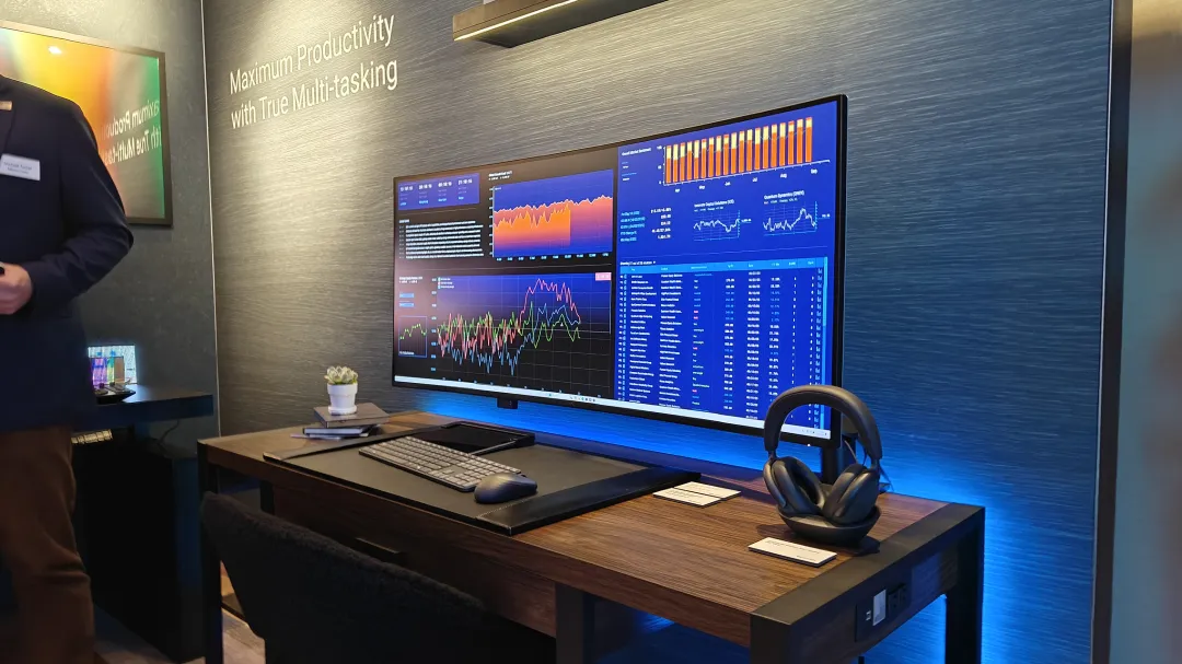 现场我重点关注了戴尔这款 UltraSharp 5.15显示器,它拥有 6K 分辨率(6144 x 2560)和 129 PPI 的像素密度,主要替代目前的双屏甚至三屏的拼接方案。这块屏幕的使用体验是非常出色的IPS Black 面板( 2000:1 的高对比度)+专业级色准表现,视觉上是非常舒适的。另外这块屏幕还优化了护眼功能,具备120Hz 刷新率,且支持一线线、40W 的反向充电的雷电 4(Thunderbolt 4)接口,多场景适应性是非常出色的。