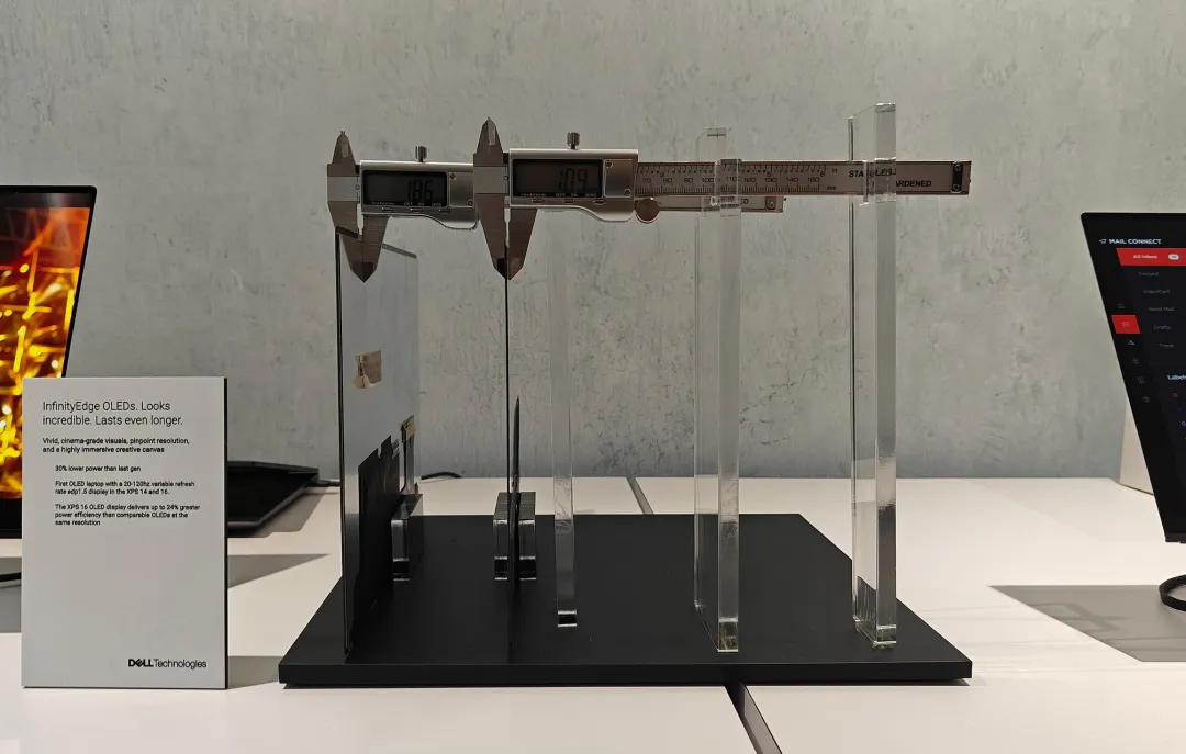 可以看到,OLED屏幕模具明显更薄,并且能够实现刷新率自适应可调等全新显示特性。另外,戴尔在2024年首发的Tandem OLED(双层发光结构OLED)屏幕也会作为选配方案正式引入到全新XPS 14与XPS 16中,这款OLED屏幕可提供影院级画质,且能实现亮度与能效的双重提升。