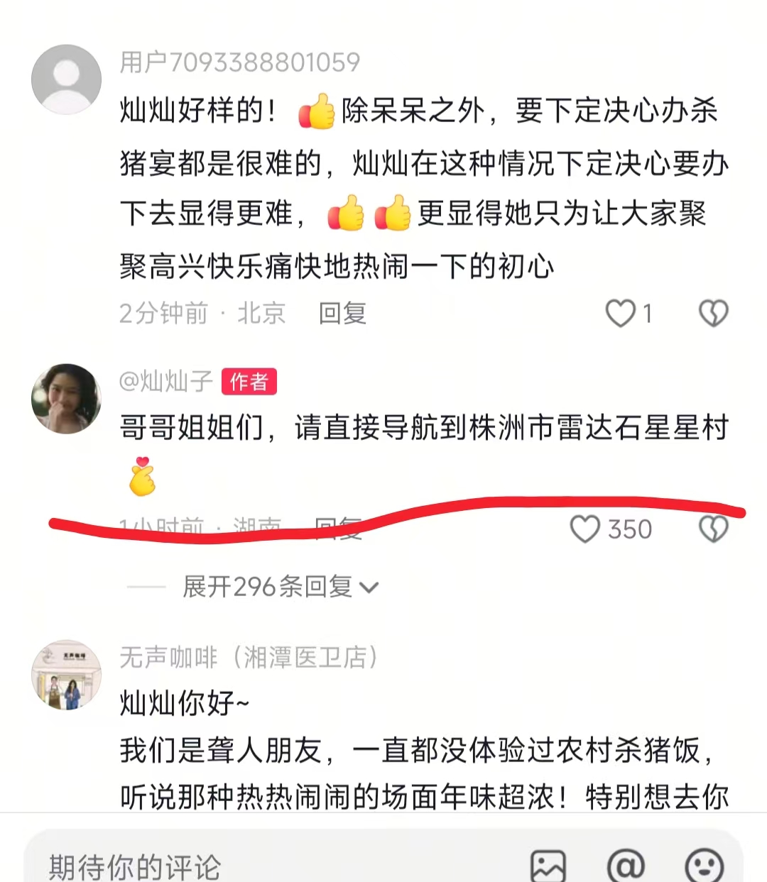 灿灿子一开始定了1月18号办刨汤饭,视频发出去后,老多人关注了,还有不少网友提前跑去她老家吃了热乎的。本来一切都好好的,结果中途出了点变故,具体啥情况也没说清,网上各种猜测,搞得灿灿子状态也不好了。