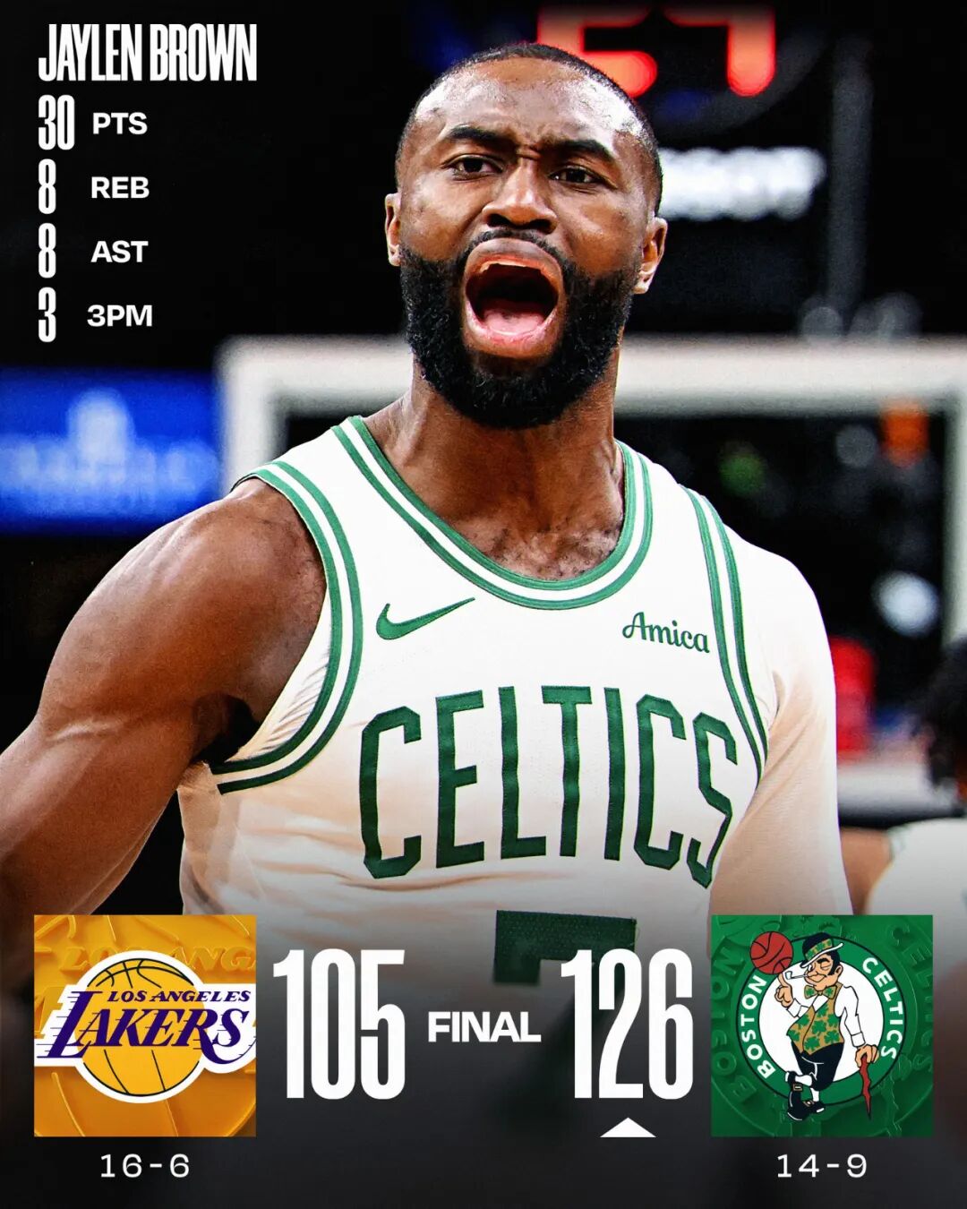 但是过去的11场比赛,凯尔特人却赢下了其中9场,期间布朗打了10场比赛,6场30+(含2场40+)、1场三双,场均30.7分7.5篮板6.0助攻,且: