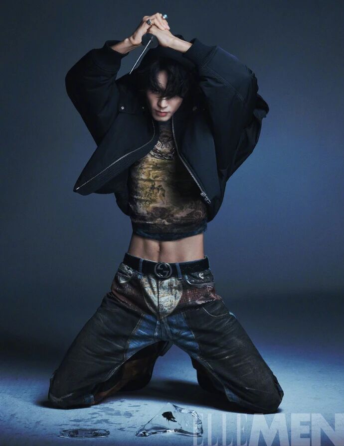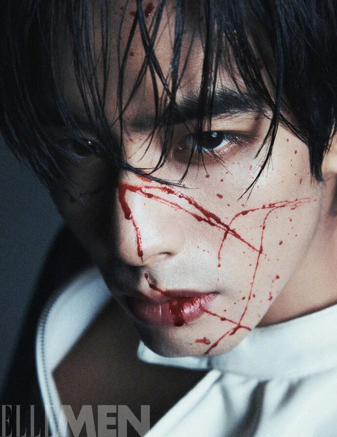 :带血痕的妆造不是 “恐怖噱头”,顺着下颌冷棱的线晕开,把 “禁欲冷感” 戳出一道 “欲感的缝”—— 冷的骨、热的痕撞出 “冽欲的张力”,不是 “硬凹的狠”,是 “型男冷感里的性感破防”。金句:“禁欲冷感的高级从不是僵成冰块,是黑奢贴着你的骨冷,血痕衬着你的魂欲 —— 宋威龙这波,是把冷冽穿成了自己骨相里的性感”。二、妆面巧思:冷骨衬欲的清冽底 —— 不是浓妆撑冷,是妆跟着他的骨相冽
