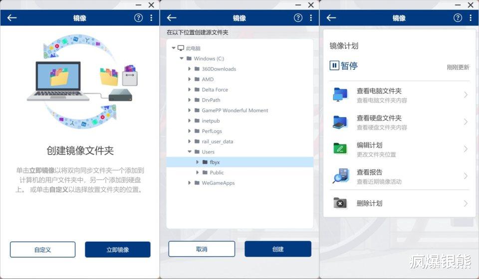 镜像功能可以让我们把重要文件备份到硬盘和PC上,从而做到数据的双重保护。在镜像模式下,我们可以任意选择文件夹及镜像计划。计划开启后,不管是改变硬盘或者PC文件夹中内容,相对应的映像文件夹内容也会自动同步变动,对于设计和视频剪辑用户而言,这个功能真心不错哈。