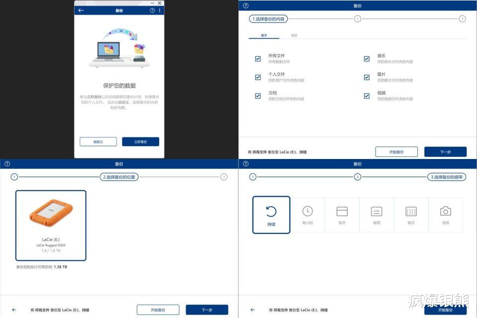 备份支持基本和高级两种模式,基本模式下仅备份个人文件、文档、音乐等文件夹中的内容,高级备份模式下支持自由选择备份文件夹,而且我们还可以选择备份频率,每小时,每天,每周,根据不同操作环境自由调节,确保重要文件的安全。