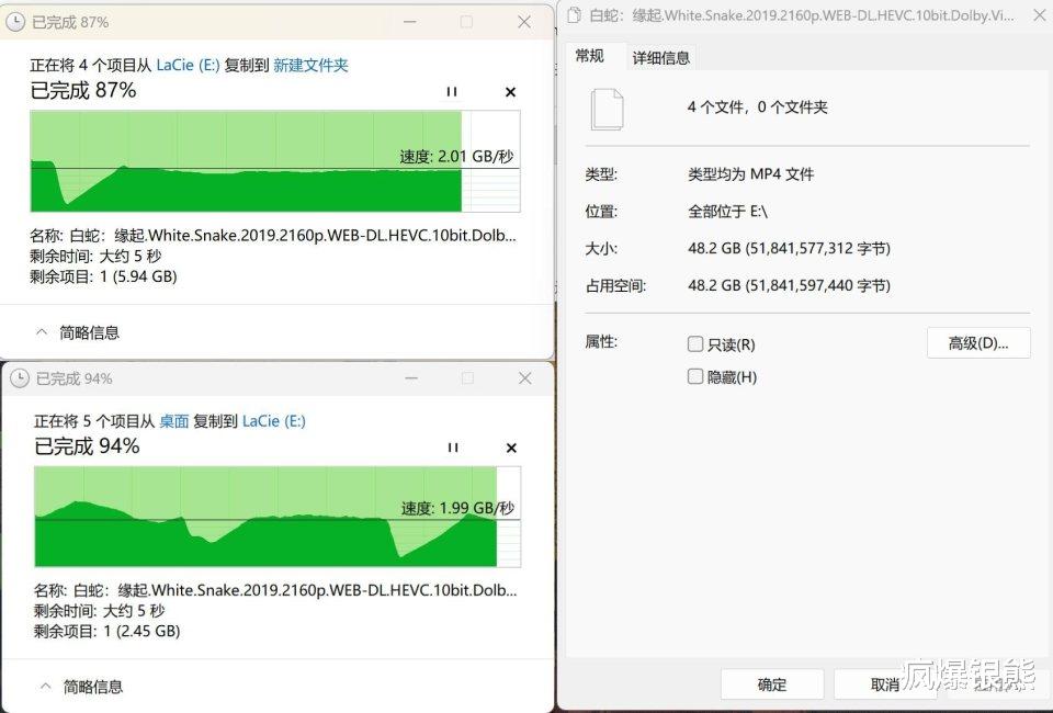 这里我也用实际文件读写做了实测,48G文件,读写速度稳定在2GB/s左右,比苹果的Mac系统稍微慢了点,但不到25秒的传输速度也很不错了。