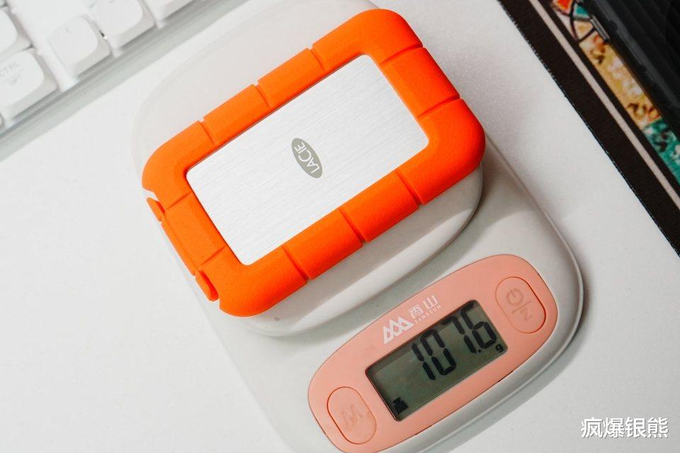 硬盘正反两面采用金属阳极氧化铝外壳,外面包裹一层橙色防震抗摔保护套,105*67mm的尺寸也不大,107克的重量不管是放在裤兜还是包包里都很轻松。