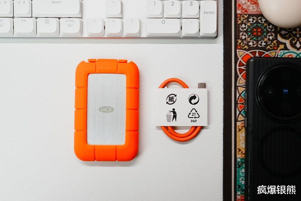 这款硬盘支持Mac和Win双系统,顶部采用一次性防撕贴设计,避免用户收到二手产品。包装内部采用符合欧盟标准的环保纸盒减震,收纳袋也是可回收材质。