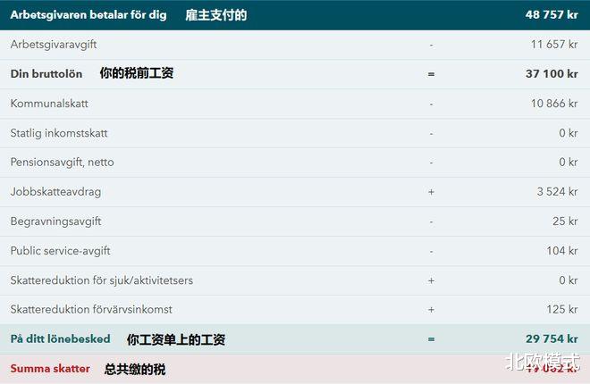 所以,如果月工资为瑞典中位数37100克朗的话,雇主实际需要支付48757克朗,雇员到手29754克朗,总共缴税19002克朗。也就是说实际税率是19002/48757=39.0%
