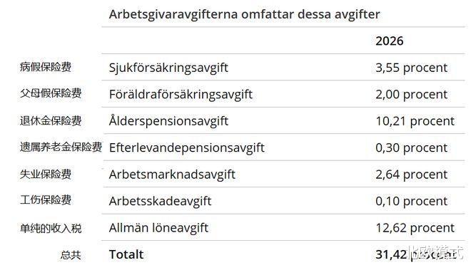 除了个人所得税以外,瑞典有一个东西叫雇主费(arbetsgivaravgift),是无论工资都要缴工资的31.42%的。虽然这个东西不叫“税”,而是叫“费”,但是它是政府强制要求缴纳的,只要给员工发工资,雇主就要交这个费,所以它本质上还是一种收入税。