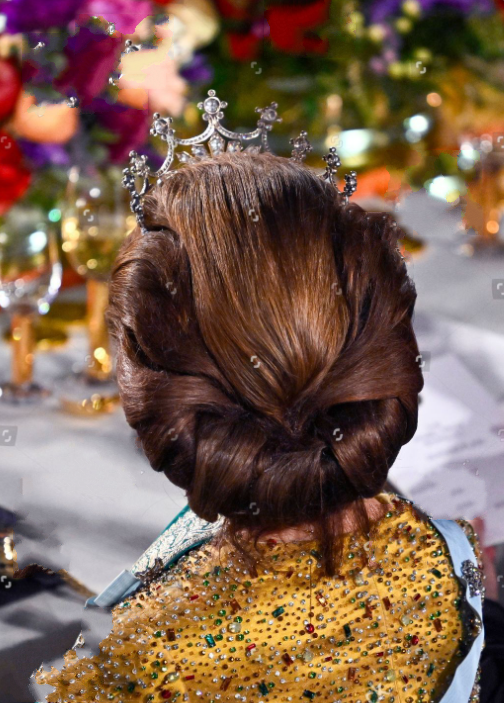 然而发型也加分不少,因为王后的头发挽起来后没有一根乱发,造型师还把皇冠与挽发结合在一起,非常的精致又给人高贵感!