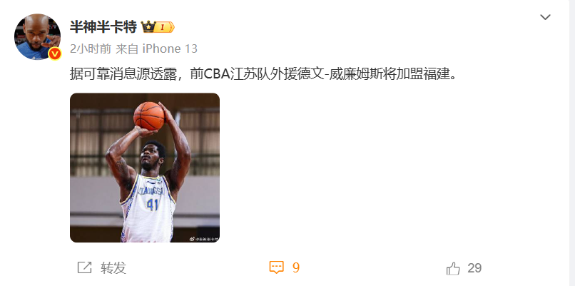 据国内媒体人“半神半卡特”最新透露,前CBA江苏队的大外援德文-威廉姆斯将加盟福建队。