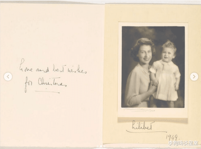 这位慈爱母亲身着白色连衣裙,佩戴珍珠项链,将 1 岁的儿子抱在膝上。小家伙笑容灿烂,顶着一头浓密的头发,身穿白色长袍。最引人注目的当属照片旁的手写留言:“致以圣诞的爱与最美好的祝福”,落款为 “莉莉贝特(Lilibet)”。