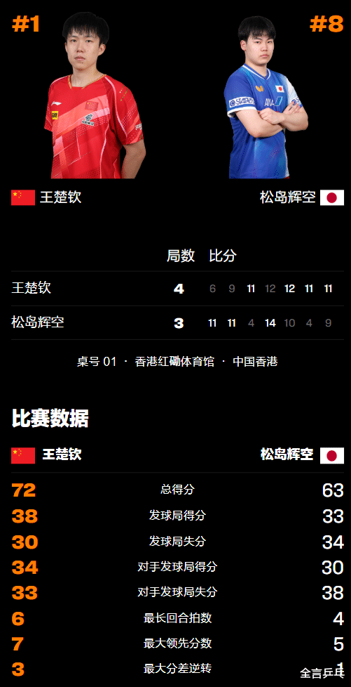首局开始后,王楚钦状态慢热上来就连丢3分,随后追至3-4但未能一鼓作气战平,后半段5-9被拉开差距后赢1分丢1球6-10出现局点,紧接着改用反手发球试图打乱对手但效果不佳,最终被松岛辉空在相持中突破正手大角度直线而再丢1分6-11落败。