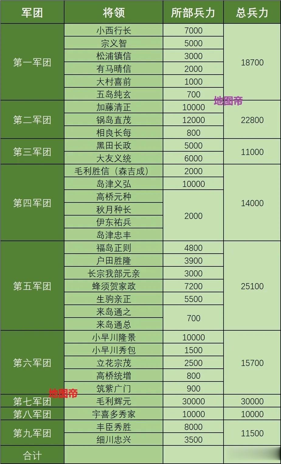 首批渡海倭军15.88万,分为九个军团,兵力如下: